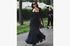 31-летняя звезда с самыми идеальными ягодицами в мире прошлась по улице в черном платье с темно-синей отделкой в виде кисточек.